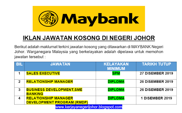 Mohon Jawatan Kosong MAYBANK negeri Johor, (tertakluk kepada tarikh tutup setiap jawatan) kepada mereka yang berminat untuk menjawat Jawatan Kosong di MAYBANK negeri Johor.