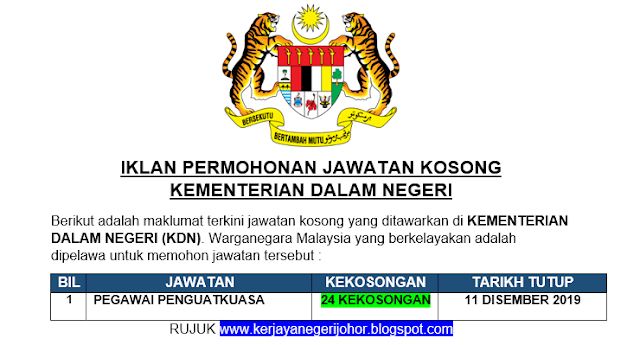 Mohon Jawatan Kosong KEMENTERIAN DALAM NEGERI (KDN), (tertakluk kepada tarikh tutup setiap jawatan) kepada mereka yang berminat untuk menjawat Jawatan Kosong di KEMENTERIAN DALAM NEGERI (KDN).