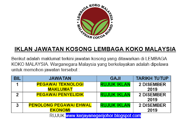 Mohon Jawatan Kosong LEMBAGA KOKO MALAYSIA, (tertakluk kepada tarikh tutup setiap jawatan) kepada mereka yang berminat untuk menjawat Jawatan Kosong di LEMBAGA KOKO MALAYSIA.