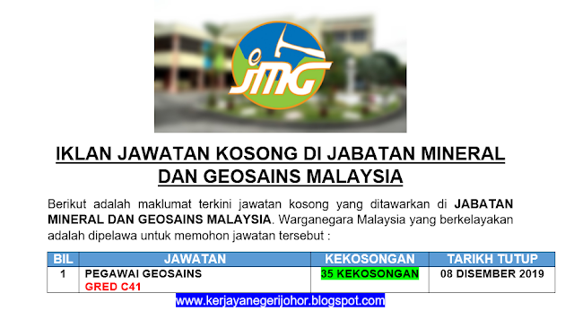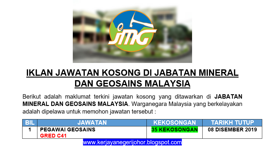 Mohon Jawatan Kosong JABATAN MINERAL DAN GEOSAINS MALAYSIA, (tertakluk kepada tarikh tutup setiap jawatan) kepada mereka yang berminat untuk menjawat Jawatan Kosong di JABATAN MINERAL DAN GEOSAINS MALAYSIA.