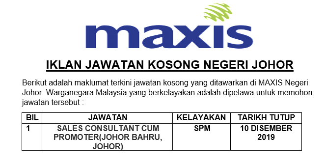 Mohon Jawatan Kosong MAXIS negeri Johor, (tertakluk kepada tarikh tutup setiap jawatan) kepada mereka yang berminat untuk menjawat Jawatan Kosong di MAXIS negeri Johor.