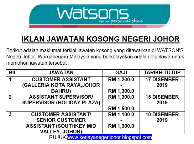 Mohon Jawatan Kosong WATSON’S negeri Johor, (tertakluk kepada tarikh tutup setiap jawatan) kepada mereka yang berminat untuk menjawat Jawatan Kosong di WATSON’S negeri Johor.