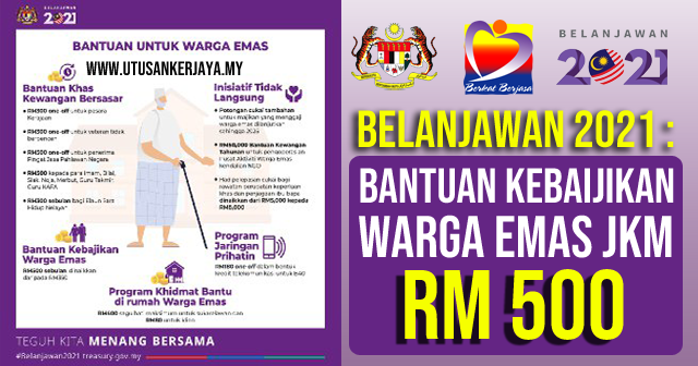 Warga emas atau orang tua yang layak dan telah berdaftar dengan Jabatan Kebajikan Masyarakat (JKM) akan menerima bantuan bulanan sebanyak RM500 pada tahun 2021.